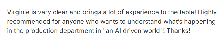 "The entire course has been extremely useful for me. Especially helpful were the PROD Encyclopedia, learning how to deal with clients, effective onboarding strategies, creating and fostering a healthy work environment, and the specific challenges and workflows of the animation industry.